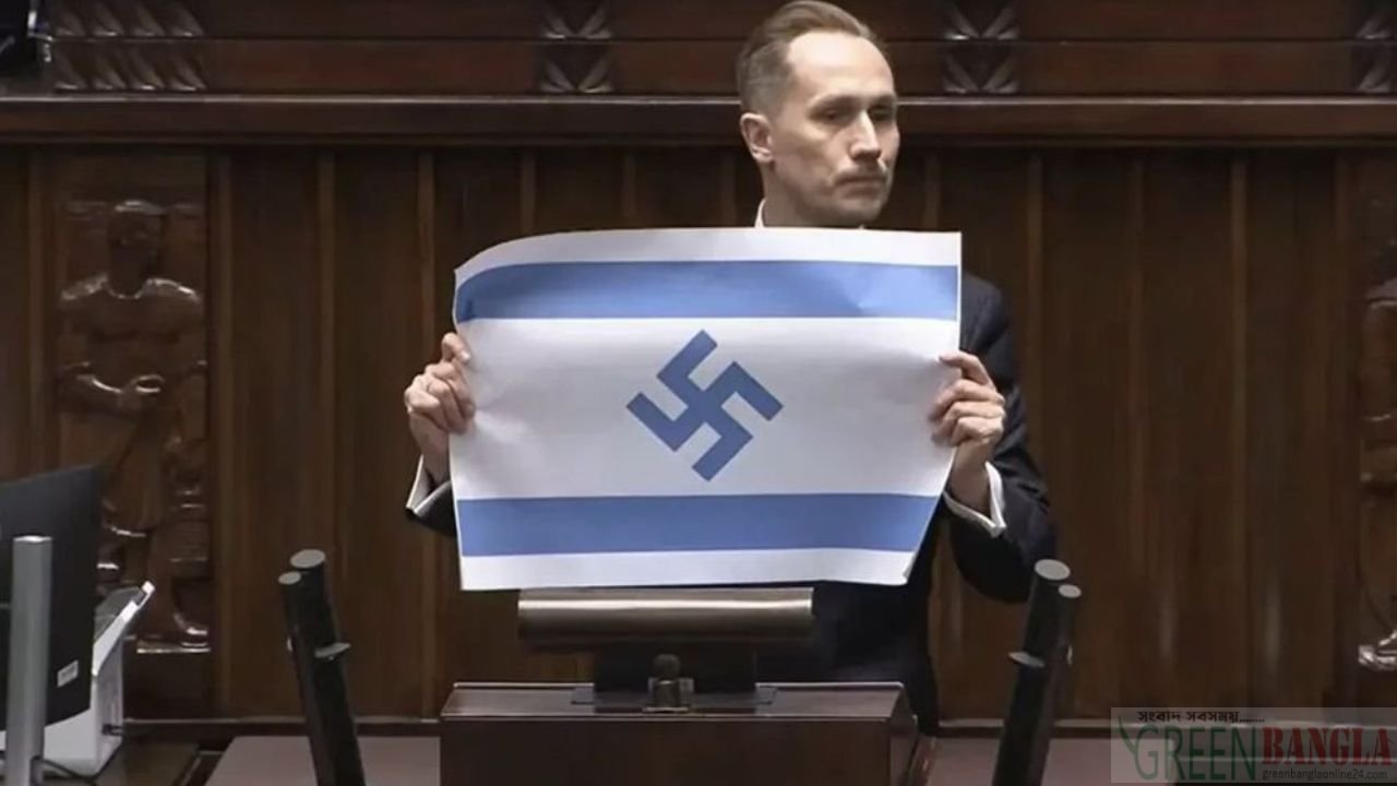 ইসরায়েলি পতাকায় নাৎসি স্বস্তিকা চিহ্ন দেখিয়ে প্রতিবাদ জানালেন পোলিশ এমপি
