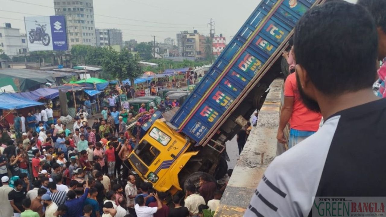ট্রাক নিয়ন্ত্রণ হারিয়ে ফ্লাইওভারের উপর ঝুলে গেল