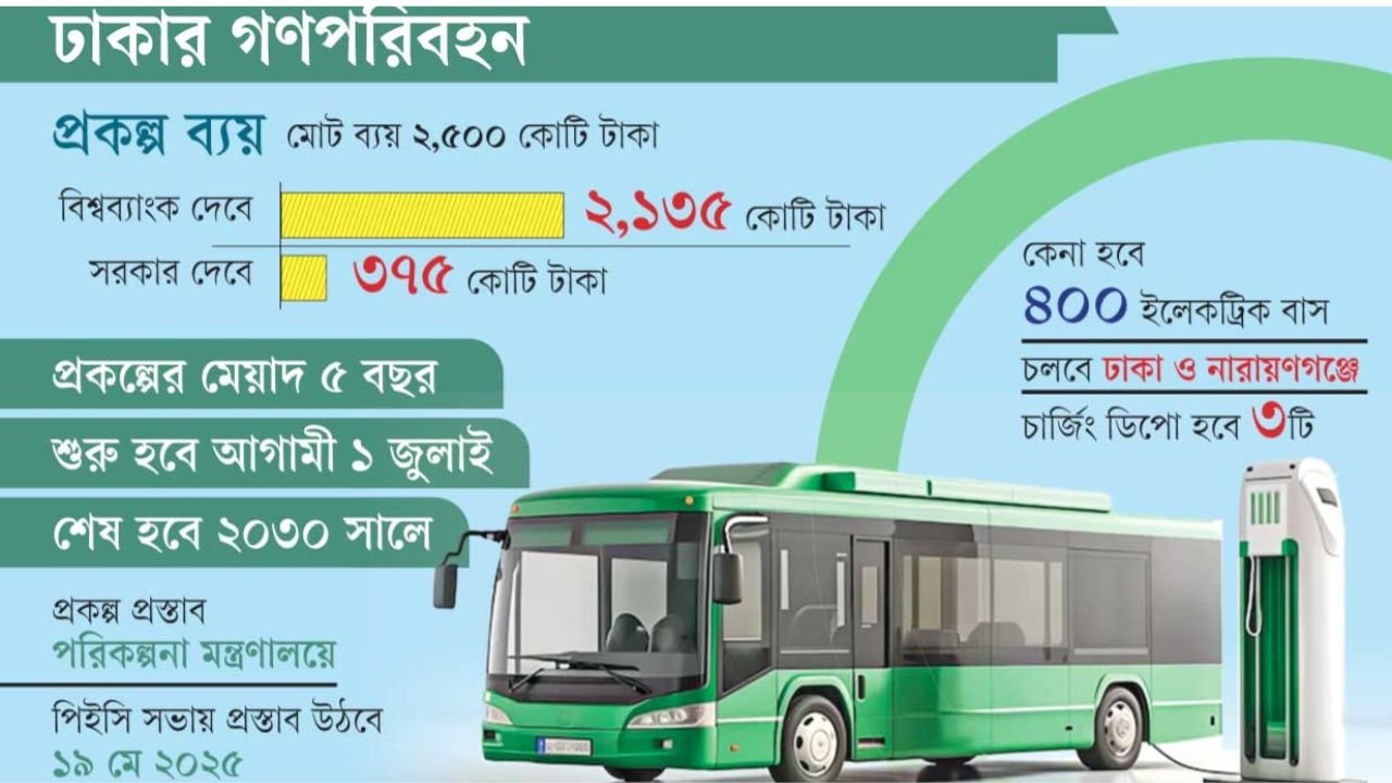 সড়ক পরিবহন ও মহাসড়ক বিভাগের পাঠানো প্রস্তাবে বলা হয়েছে যে, প্রকল্পে ৪০০টি বৈদ্যুতিক বাস কেনা হবে। এই বাসগুলির জন্য তিনটি ডিপো এবং চার্জিং স্টেশন থাকবে। বাসগুলি ঢাকা ও নারায়ণগঞ্জে চলবে। প্রস্তাবটি ১৯ মে প্রকল্প মূল্যায়ন কমিটির (পিইসি) সভায় উত্থাপিত হবে। এছাড়াও, প্রকল্পের খরচ সহ বিভিন্ন বিষয়ে আলোচনা হতে পারে।