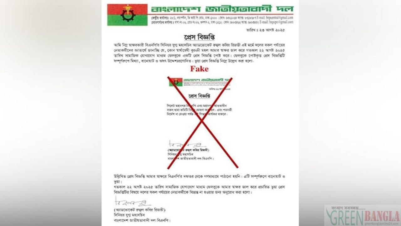 BNP Senior Joint Secretary General Advocate Ruhul Kabir Rizvi has requested leaders and activists not to be confused by fake and fabricated press releases posted on Facebook with forged signatures. This was stated in a release signed by Rizvi. The same information was also published on the Facebook page of BNP’s media cell. The release said that a completely fabricated and fake press release has been spread on social media which was not sent to any media from the BNP office. A malicious group has posted this release by forging Rizvi’s signature. Leaders and activists at all levels of the party are requested not to be confused by this. Advocate Ruhul Kabir Rizvi told BNP leaders and activists that a self-interested malicious group has posted a press release on Facebook on August 22 by forging his signature. It is completely false, fabricated and circulated for malicious purposes. Rizvi said that no press release from the BNP office under his signature was sent to the media. The circulated release is fabricated and fake. Source: BSS.