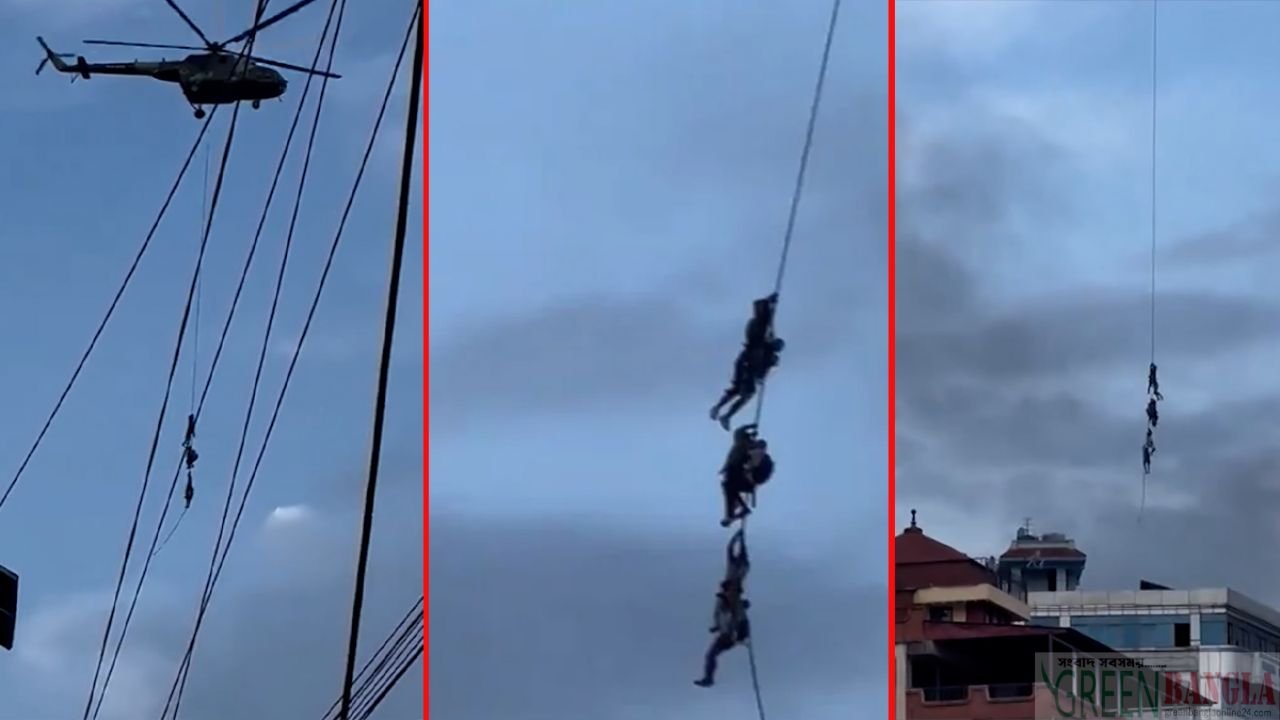 Footage of the Gen-G protests in Nepal has been gradually emerging. Several videos of the country’s ministers fleeing due to the movement have been found. In one of them, the country’s minister and his family members are seen clinging to a rope (rescue sling) that fell from an army helicopter. The video went viral on social media today (September 11). In it, a helicopter is seen flying over the minister’s house. The minister and his family members are clinging to the rescue sling that fell from there. The plane then took them to safety. Thick black smoke can be seen rising in the sky at this time. Since the protests began in Nepal, the houses of several ministers and government officials have been burned. Many have been publicly harassed and physically assaulted. It is believed that this is why many have decided to flee. The incident began after Nepal imposed a ban on social media. This decision triggered the Gen-G generation of protests. It quickly turned violent. Last Tuesday, protesters began setting fire to and vandalizing government and private buildings across the capital. In the meantime, Prime Minister KP Sharma Oli was forced to resign. An emergency curfew was imposed and the army was deployed to control the situation. The army has started patrolling the capital and has ordered people not to leave their homes unless necessary.